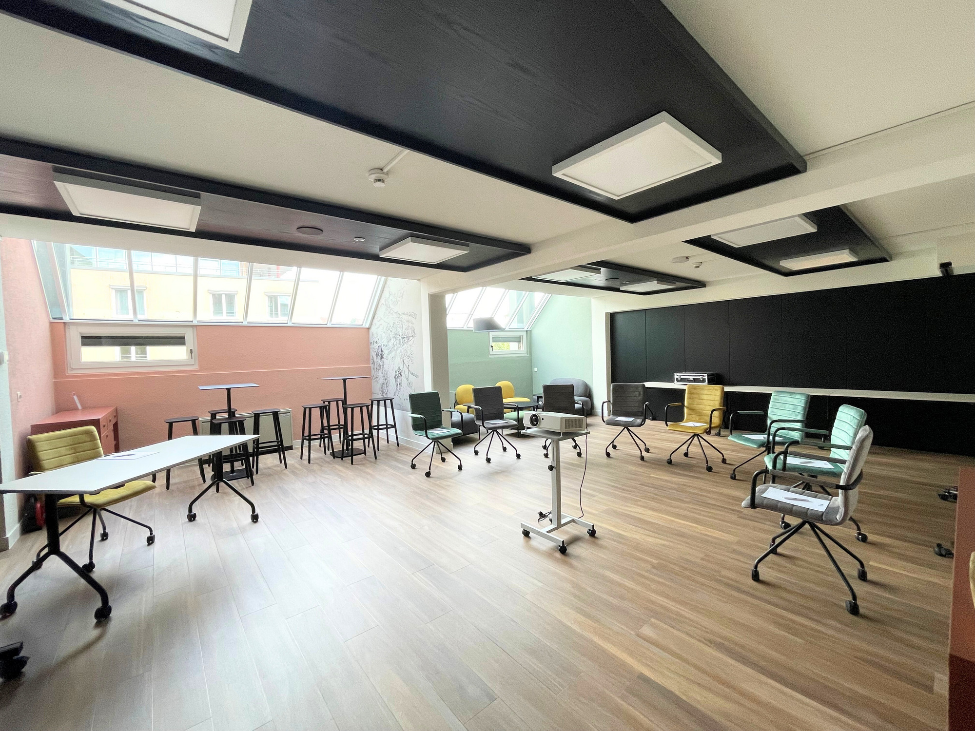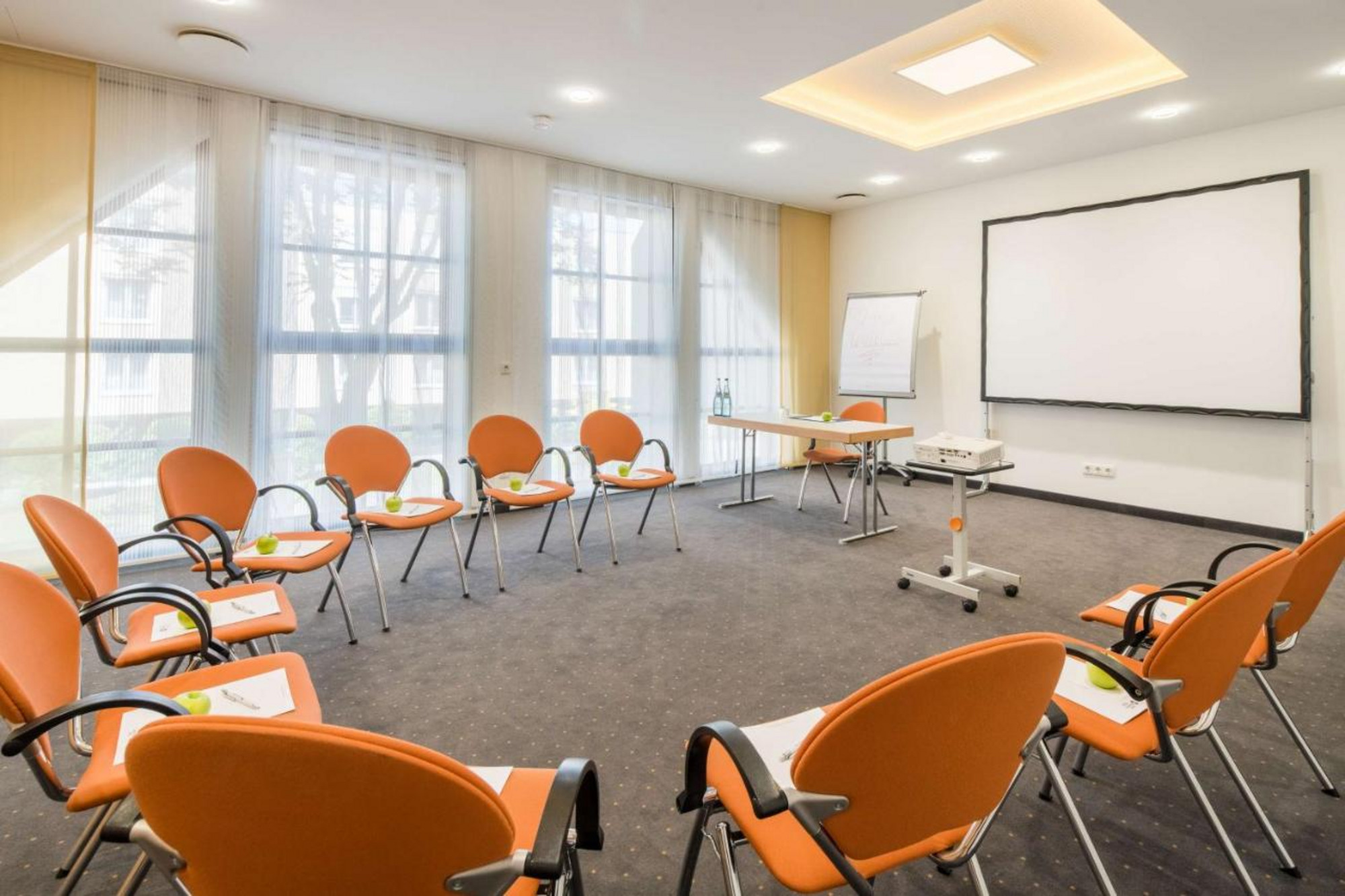 - Standardtechnik im Hauptraum (1x Beamer, 1x Leinwand, 1x Flipchart, 1x Pinnwand, 1x Moderationskoffer, Stifte und Blöcke)